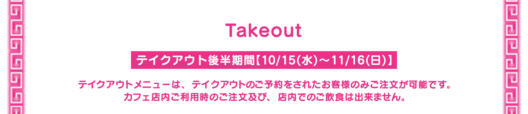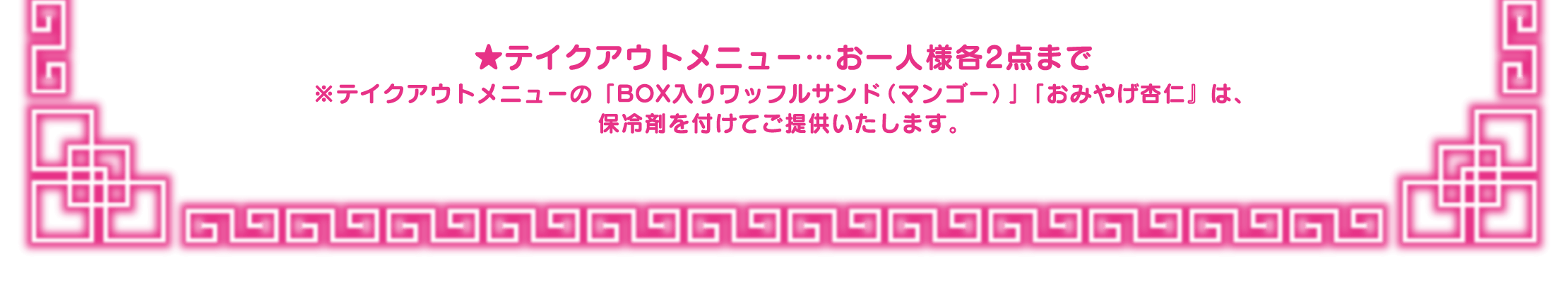 ※1回のご注文でオーダーいただけるメニューの数量に制限をかける場合がございます。また、制限の数は会期前・会期中に関わらず、予告なく変更になる場合がございます。