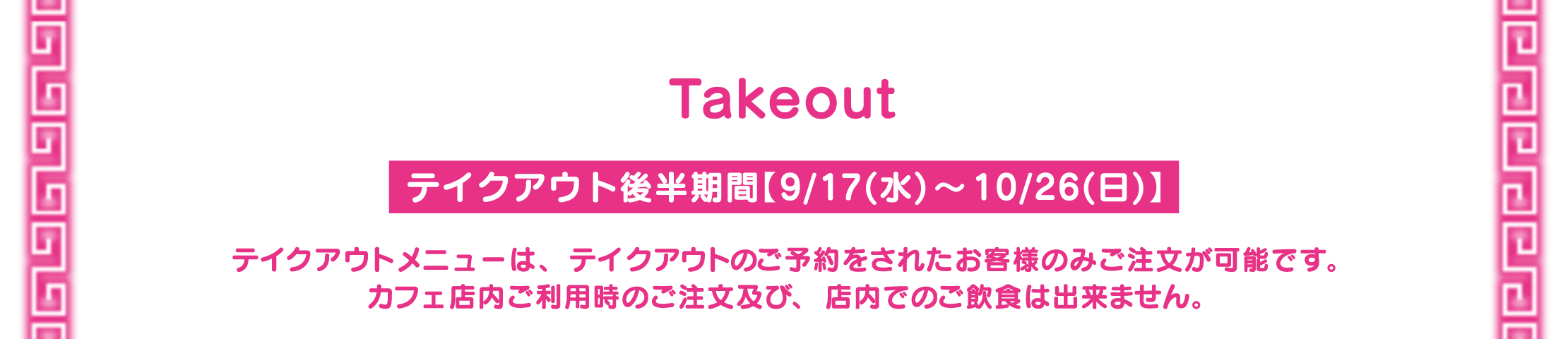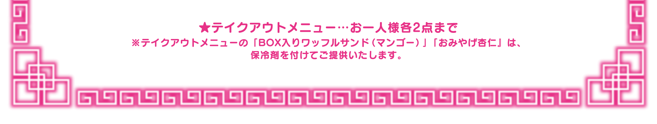※1回のご注文でオーダーいただけるメニューの数量に制限をかける場合がございます。また、制限の数は会期前・会期中に関わらず、予告なく変更になる場合がございます。